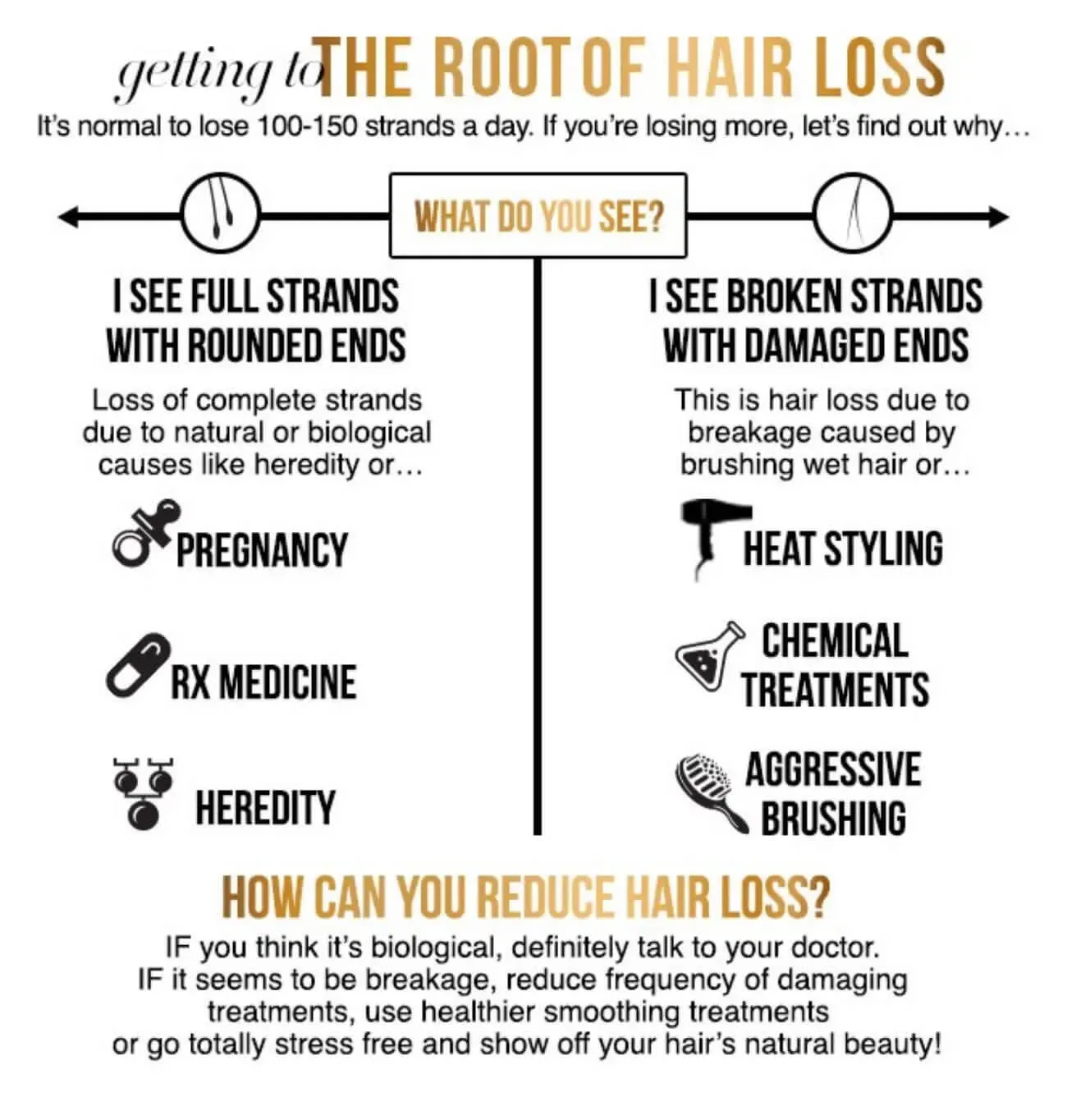 So How Do I Fix It?A dermatologist would have to make a personalized diagnosis before prescribing anything specific, but Dr. Jolliffe says that she generally advises patients to take vitamins for hair in order to improve hair health. Also, those minutes spent using a straightening iron or blow dryer each morning add up and eventually lead to hair breakage and loss. Minimizing trauma to the hair and scalp will aid in preventing against both.